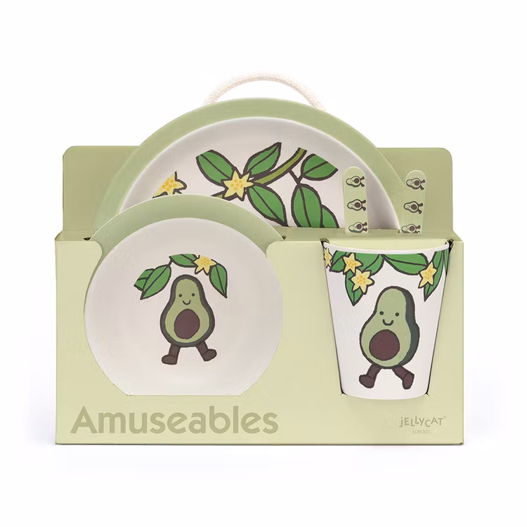 Fin servis tillverkad av bambufiber och med charmigt motiv av den mysiga Amusable avokadon. Den snygga presentförpackningen innehåller: djup tallrik, flat tallrik, mugg, sked och gaffel.