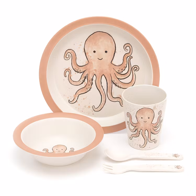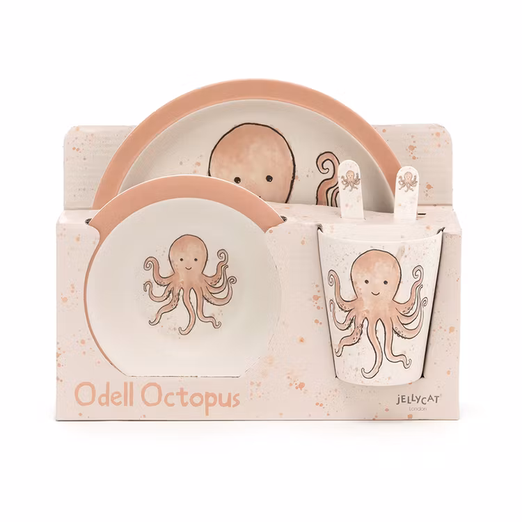 Från +4 månaderFin servis tillverkad av bambufiber och härligt motiv med den alltid glade Odell. Den snygga presentförpackningen innehåller: djup tallrik, flat tallrik, mugg, sked och gaffel.Servisen tål maskindisk men inte mikro.