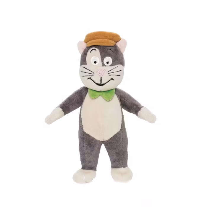 Pelle Svanslös gosedjur. Helt sydd i tyg, med en liten brun keps och en grön rosett runt halsen. Och så bara en liten snutt till svans, ty råttan bet av den en gång...!
