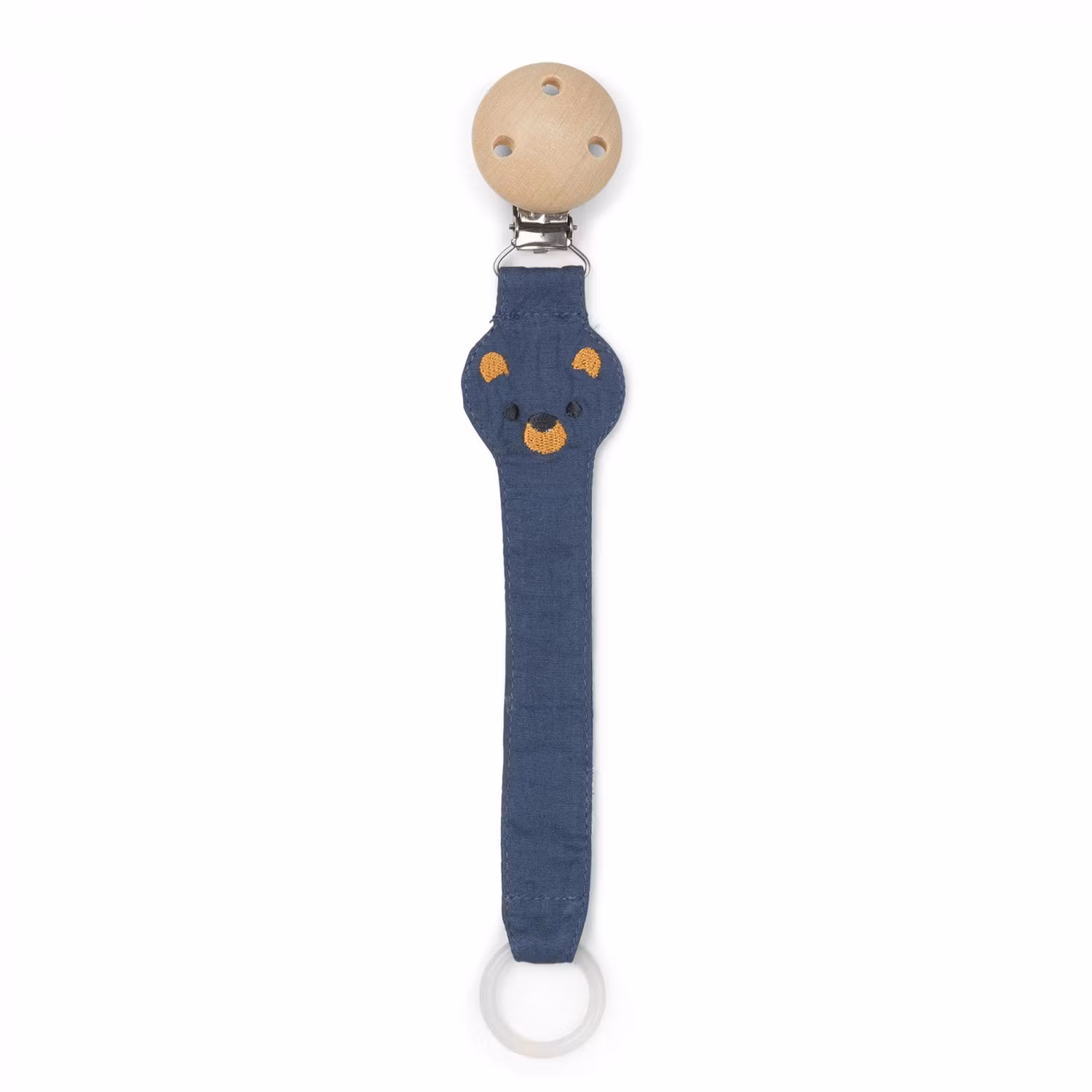 Träclip för att enkelt fästa på ett klädesplagg så att nappen inte tappas och är enkel för barnet att hitta.