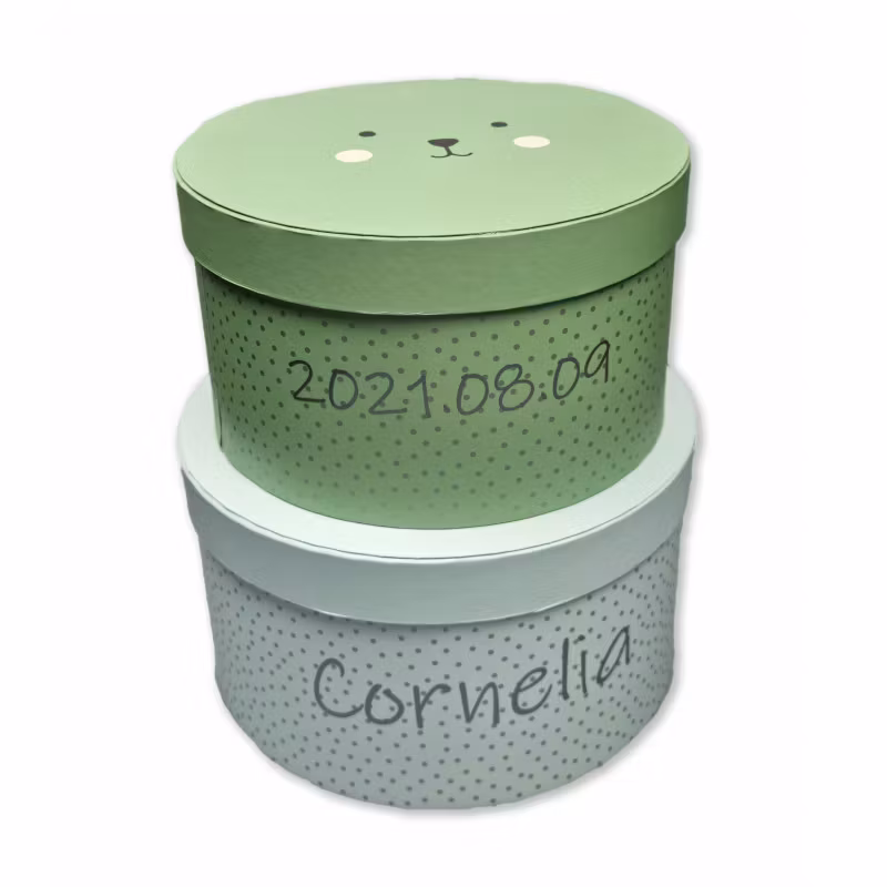 Stilrena runda förvaringsaskar i hård kartong som kommer i 2 olika storlekar. Med dessa askar kan barnen enkelt hålla ordning på sina saker. De kan staplas ovanpå varandra eller inuti varandra. Askarna blir en fin inredningsdetalj i barnrummet.