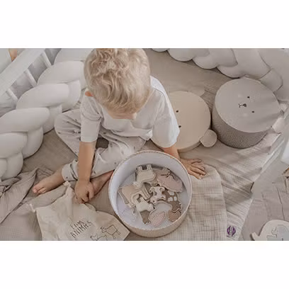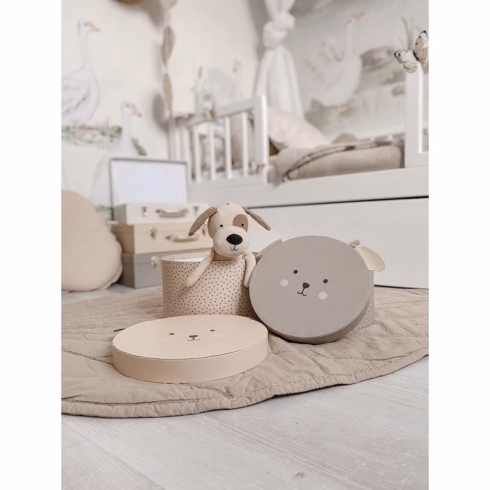 Stilrena runda förvaringsaskar i hård kartong som kommer i 2 olika storlekar. Med dessa askar kan barnen enkelt hålla ordning på sina saker. De kan staplas ovanpå varandra eller inuti varandra. Askarna blir en fin inredningsdetalj i barnrummet.