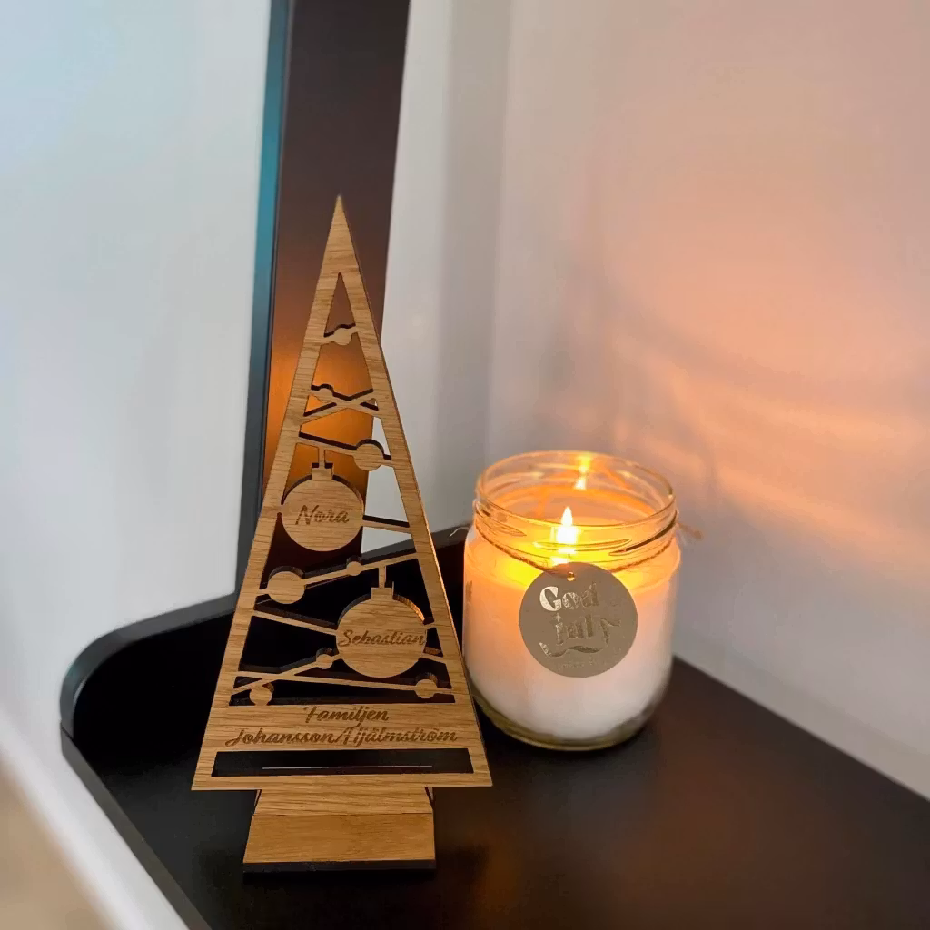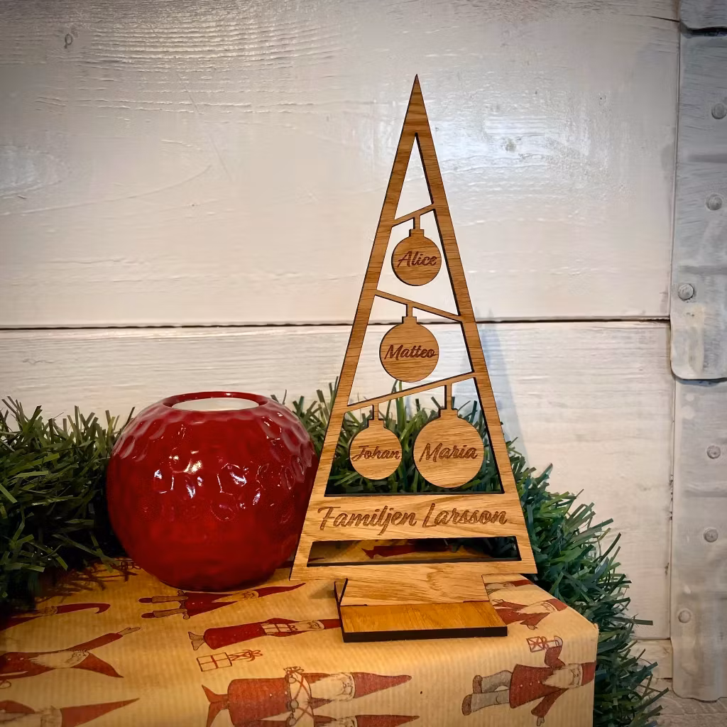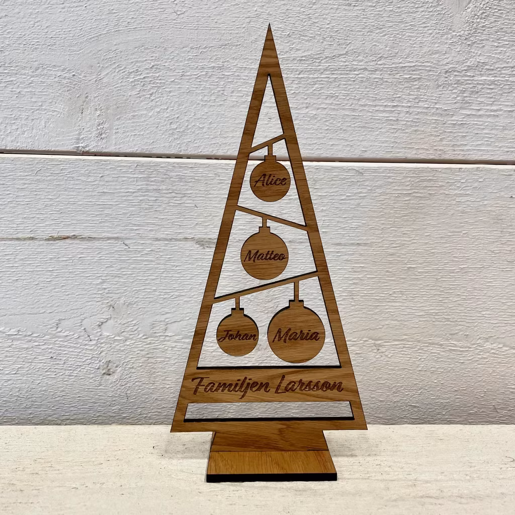 Skapa minnen och en unik jultradition med vår familjegran av oljad ek, skräddarsydd med valfria namn för varje medlem i din familj. Denna charmiga julprydnad är inte bara en dekorativ detalj utan också ett uttryck för gemenskap och familj under julsäsongen.