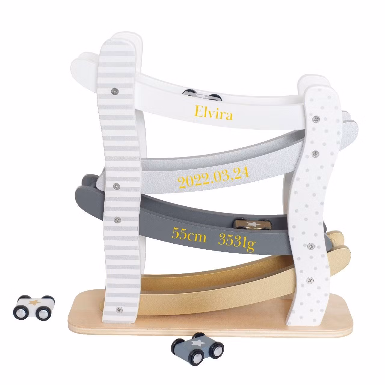 En kreativ och rolig bilbana i härliga färger och med personligt namn och datum för alla biltokiga barn.