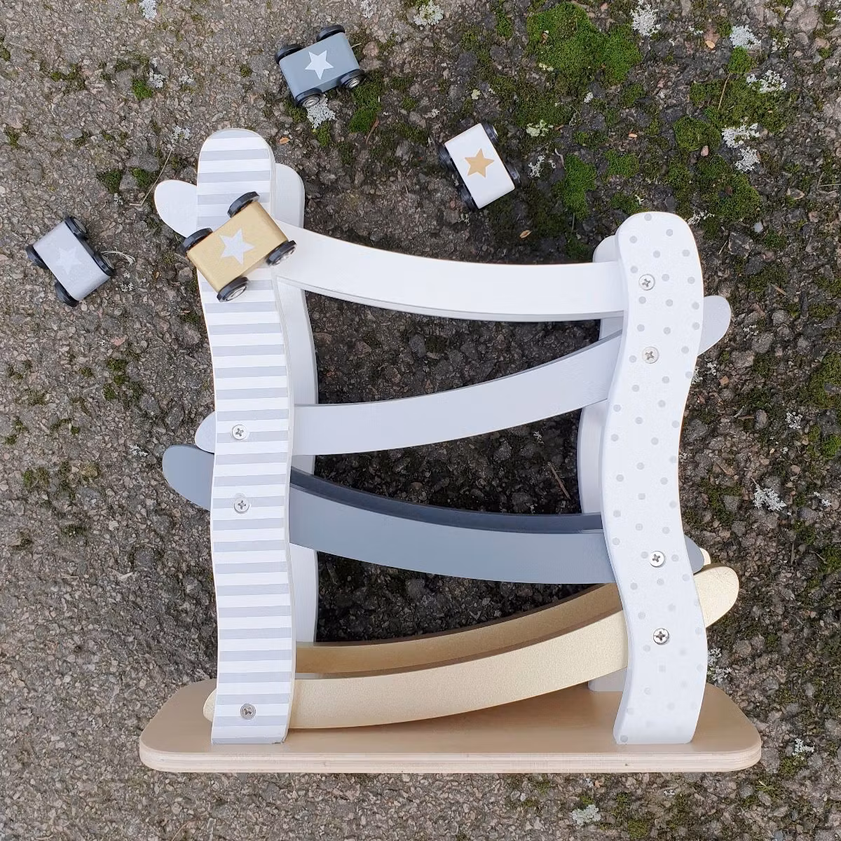 Släpp bilarna längst upp från banan och se hur de snabbt åker hela vägen ner.