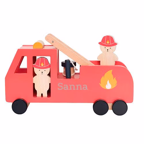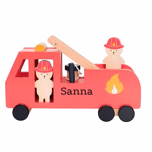 Nu kan ditt lilla barn ha sin egen brandbil med sitt namn på. Med denna tuffa brandbil är du snabbt framme när det brinner. De 2 små brandmännen som är med klättrar upp för stegen med sin slang och släcker branden. Stegen går att vrida åt olika håll och kan även fällas ner. Brandslangen rullar man in igen när man är klar och stoppar ner i sin hållare. Köp din brandbil med namn idag och ge ditt barn en unik lekupplevelse.