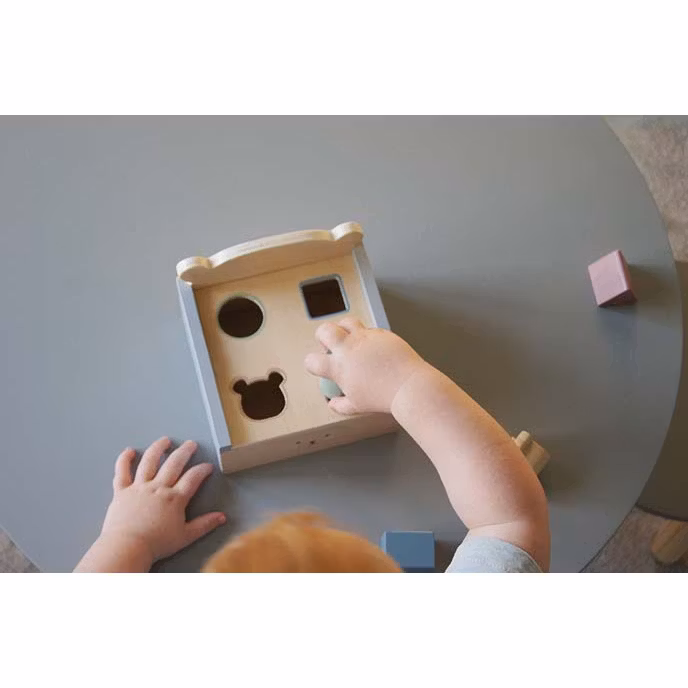 Sorteringslådan innehåller avtagbart lock och fyra olika figurer, trekant, nalle, kub och cylinder i fyra olika färger som ska passa in i de olika hålen.