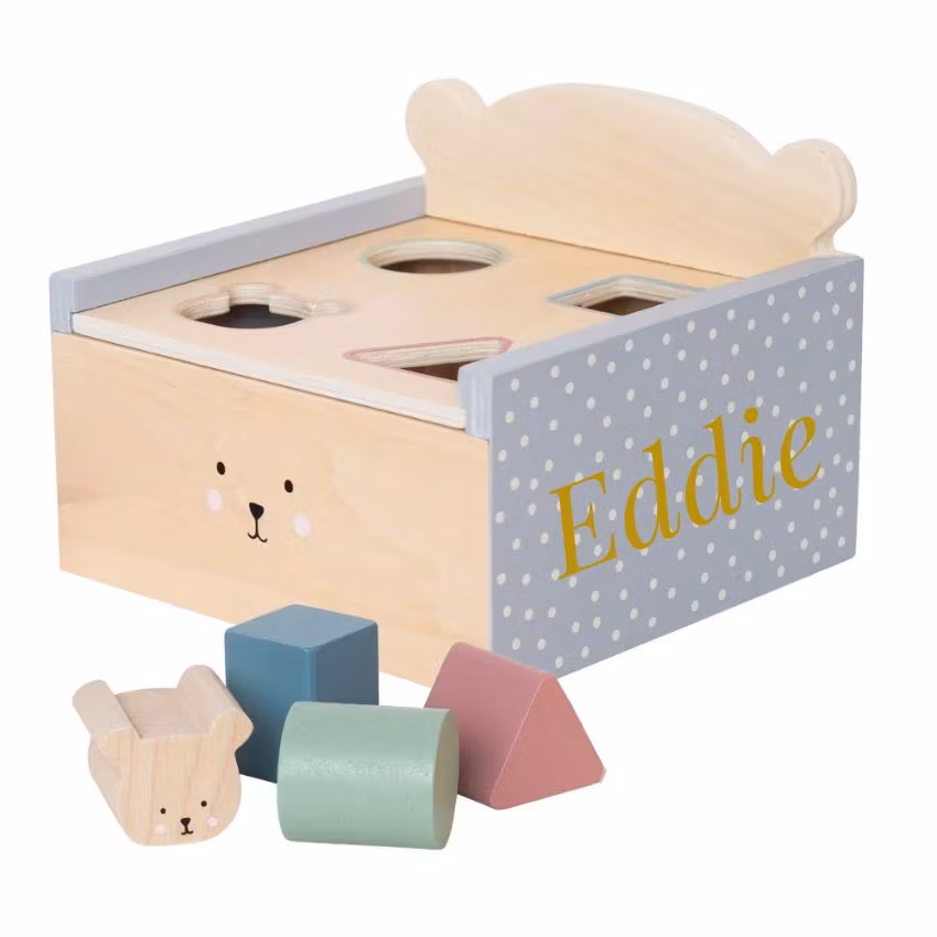 Sorteringslåda i mjuka härliga färger och med personligt namn i guldfärg.