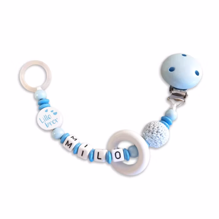 Söt personlig napphållare med en motivet "Lillebror" och en ring som barnet kan leka med.