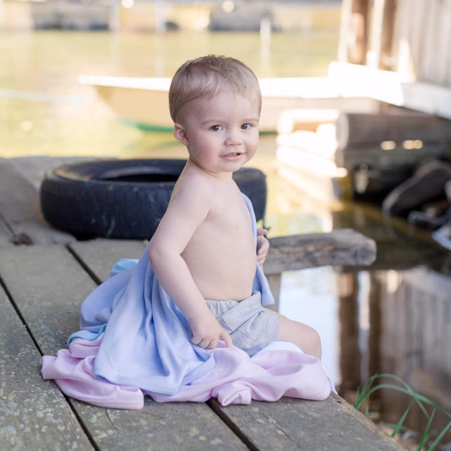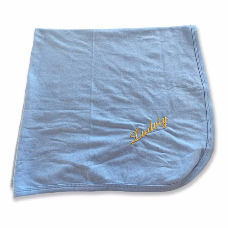 Blå babyfilt med personlig brodyr.