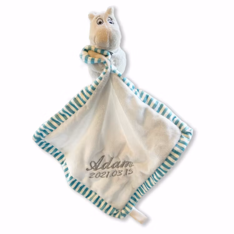 En härlig vit och blå snuttefilt med brodyr i en fin silvrig färg med motiv av de populära mumin.