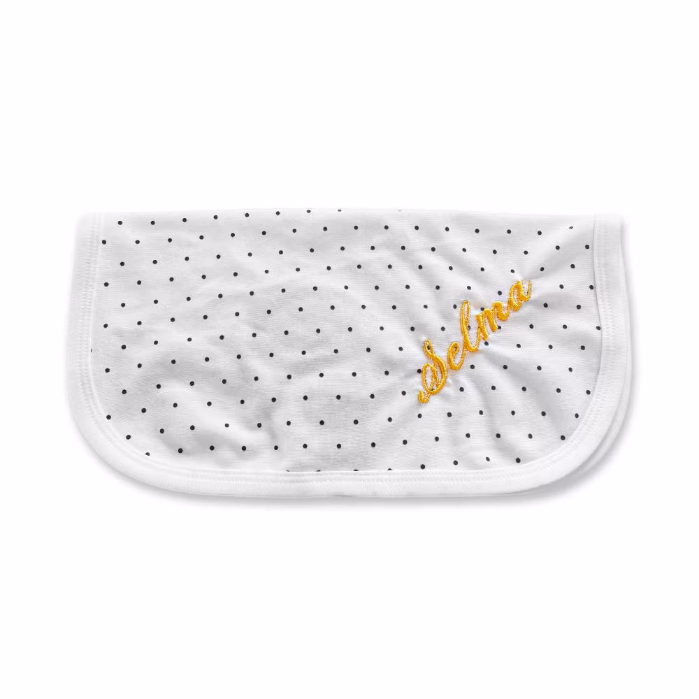 En liten mjuk och mysig babyfilt med brodyr i vacker guldig färg i hörnet.