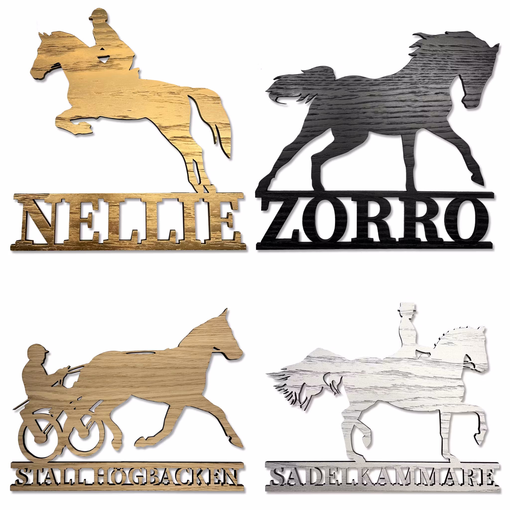 För den hästälskande själen presenterar vi vår exklusiva hästskylt av ek, där du kan välja det önskade namnet för en extra personlig prägel.